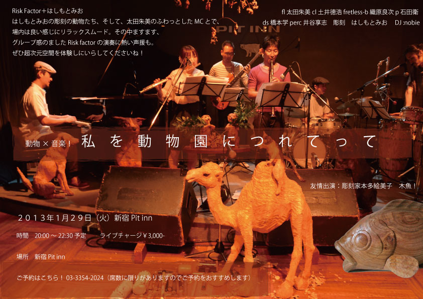 動物の彫刻がならんだライブハウスで、大活躍、太田朱美ちゃんのフルートを筆頭に動物たちのような演奏者の方々のすばらしい生演奏のもと、はしもとみおが、一曲コラボレーション企画として、木彫りの音を奏でるこの企画、毎年明けの人気恒例企画となりました