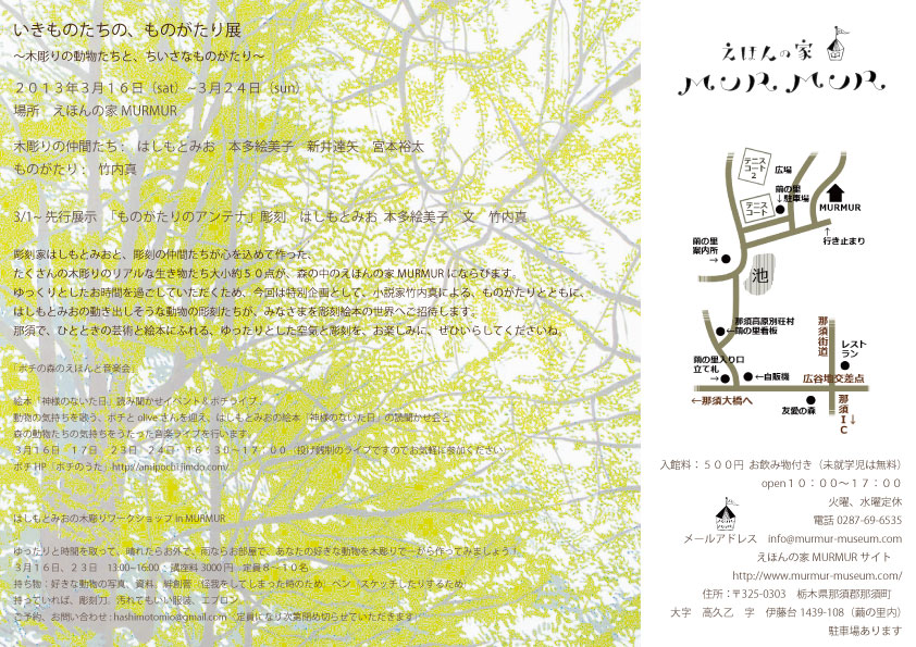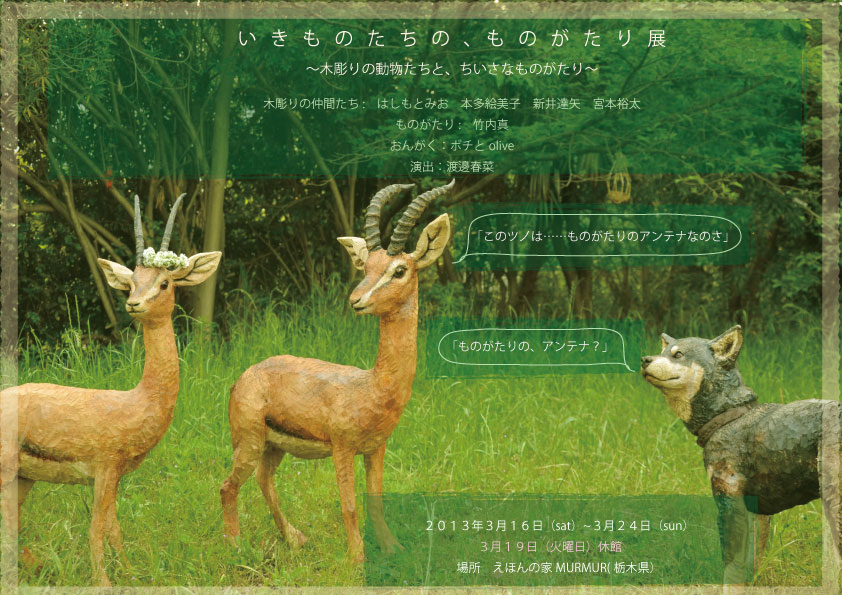 彫刻家はしもとみおと、彫刻の仲間たちが心を込めて作った、たくさんの木彫りのリアルな生き物たち大小約50点が、森の中のえほんの家MURMURにならびます。