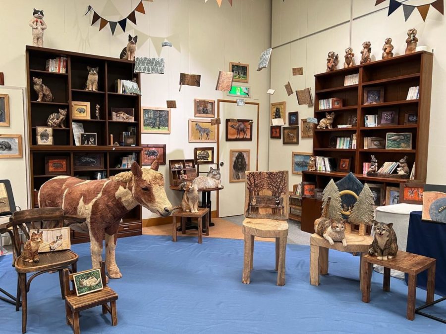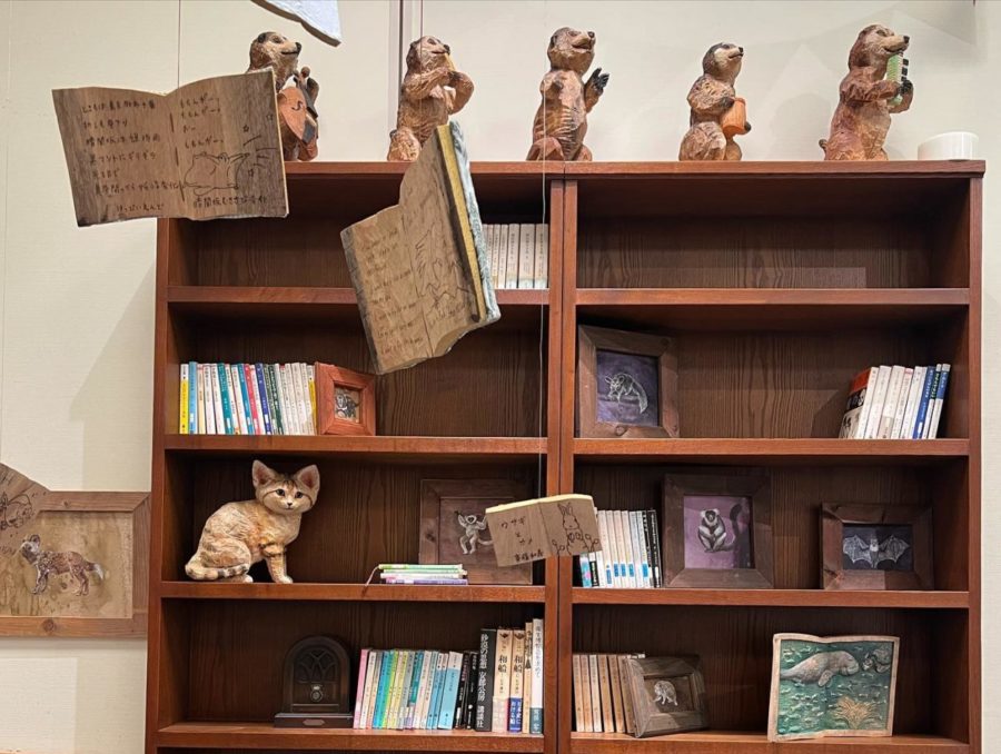 新作の本のレリーフシリーズや、ブックエンドの椅子など、本にまつわる木彫りの動物達も連れて行きます。