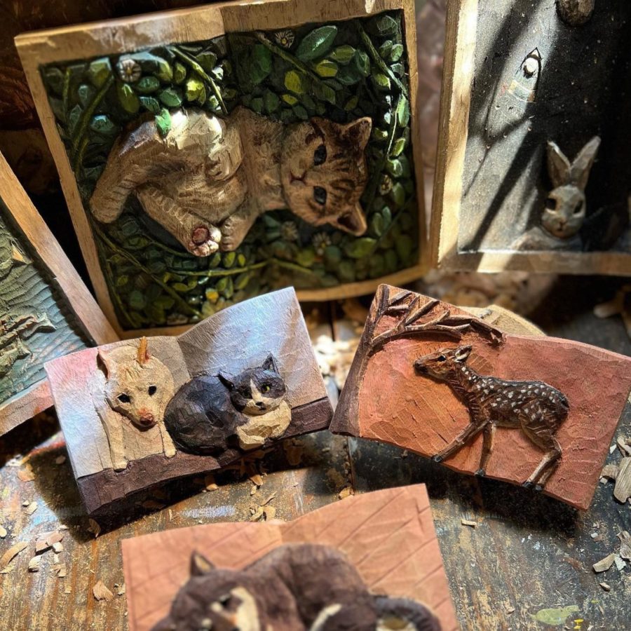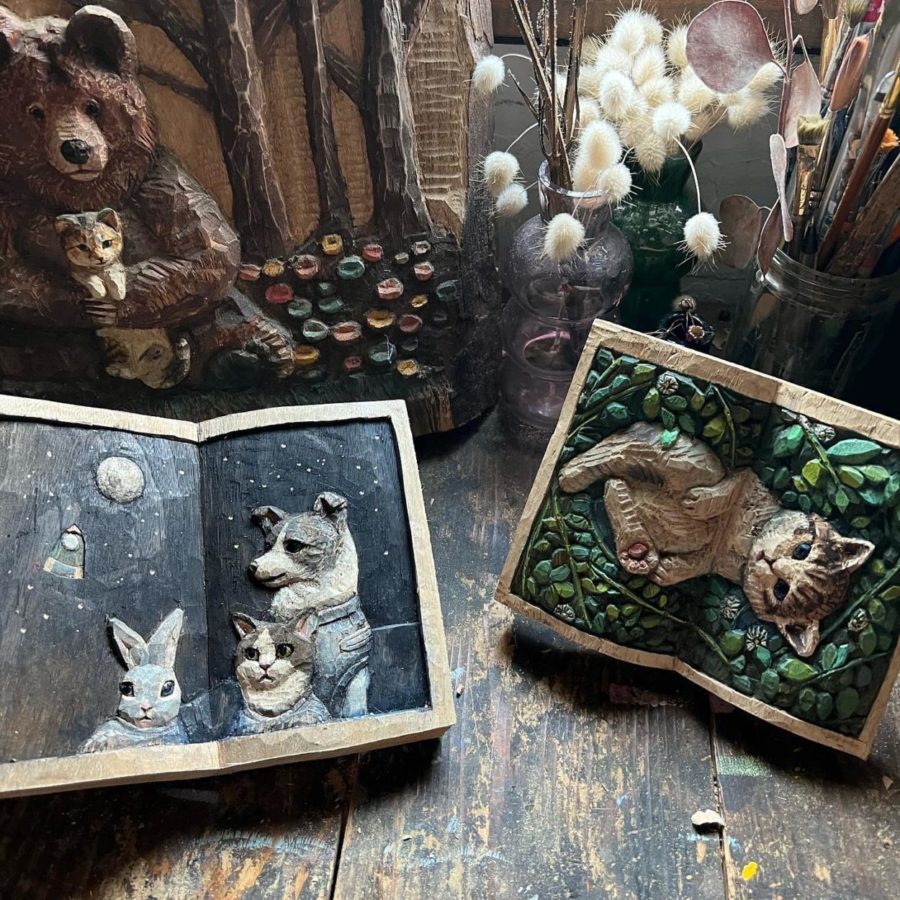 「本を開くように動物との思い出もぱっと開けたらいいな」という思いから制作を始めた、 本を開いたままの形に、思い出の一ページを彫り込んだ木彫りのレリーフ本たち。