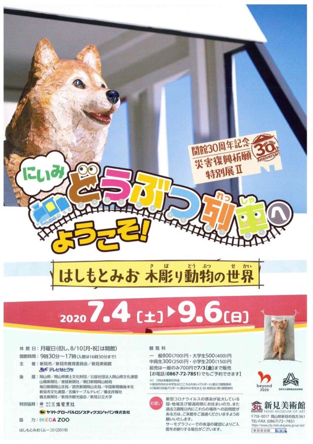 新見美術館にいみどうぶつ列車へようこそ!木彫り動物の世界 開催日DATE2020.7.4[土] 〜 2020.9.6[日] 開館時間OPEN9:30~17:00 休館日CLOSED月曜(8/10は開館) 開催地LOCATION新見美術館〒718-0017 岡山県新見市西方361 入場料ADMISSION一般800円、大学生500円、中高生300円、小学生200円 URLWEBSITEhttps://www.city.niimi.okayama.jp/usr/art/