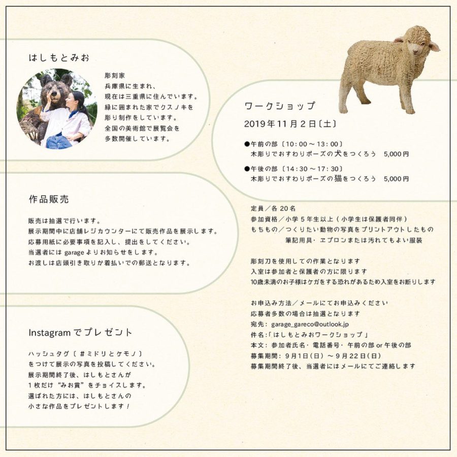 gareco[ガレコ]ミドリと暮らすケモノたち 開催日DATE2019.10.24[木] 〜 2019.11.6[水] 開館時間OPEN11時~20時 休館日CLOSED毎月第3木曜日 開催地LOCATIONgareco[ガレコ]〒453-6190 愛知県名古屋市中村区平池4-60-12 グローバルゲート3F/garage店内 入場料ADMISSION無料 URLWEBSITEhttp://www.garage-garden.com/